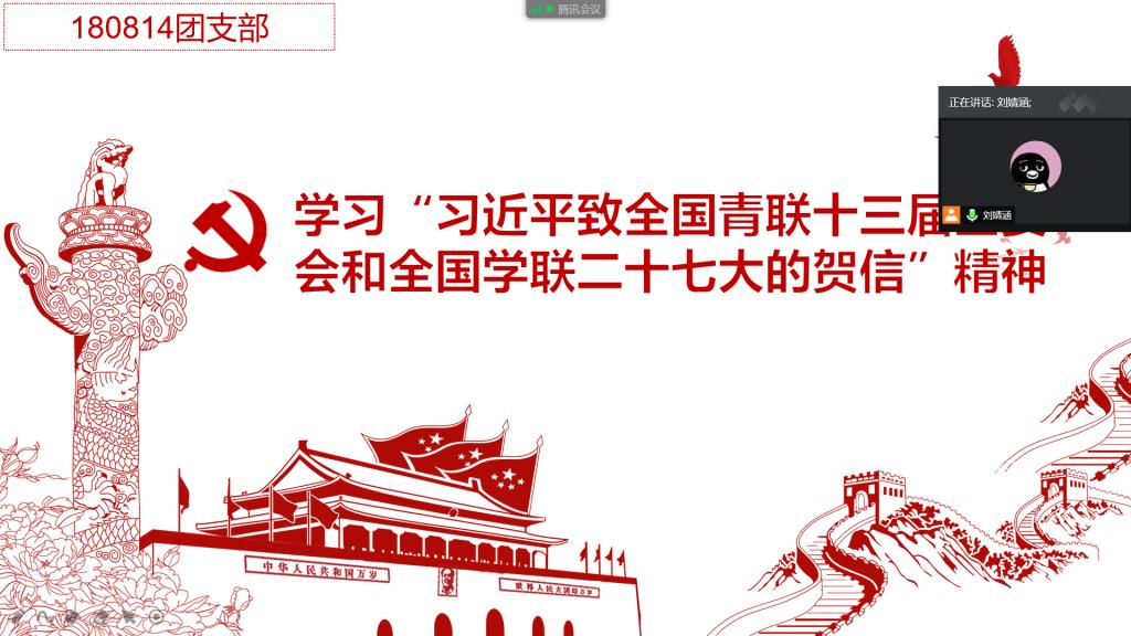 9月19日,180815团支部在线上开展了学习“习近平总书记致全国青联十三届全委会和全国学联二十七大的贺信”精神的主题活动,团支书郭子璇首先为大家朗读了习近平总书记贺信,并针对贺信分享了自己的感想,号召团员们牢记习近平总书记谆谆教诲,不忘初心使命。随后,预备党员徐振航铭针对习近平总书记贺信精神分享了自己的感想,勉励大家秉承先辈精神,履行时代使命,毅然前行。入党积极分子代表梅崇煜结合假期抗疫志愿服务和大家分享了自己的体会。最后,同学们开展交流讨论,气氛热烈。