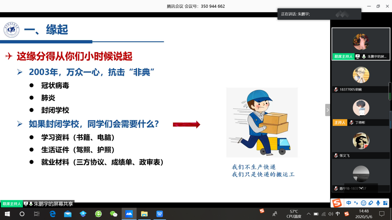 最后,朱鹏宇导员以聊天的形式,以“我在北航开驿站”为切入点,与同学们分享导员们在此次疫情中的所作所为所感。本来准备除夕前回家的朱导,想到一旦推迟返校同学们在家可能有种种不便之处,便决定留在公司等一等公司安排,看自己留在公司能不能为同学们提供一些帮助,没想到这一等就等到了夏天,导员的“驿站”为全国各地的经管学子提供了不少帮助。
