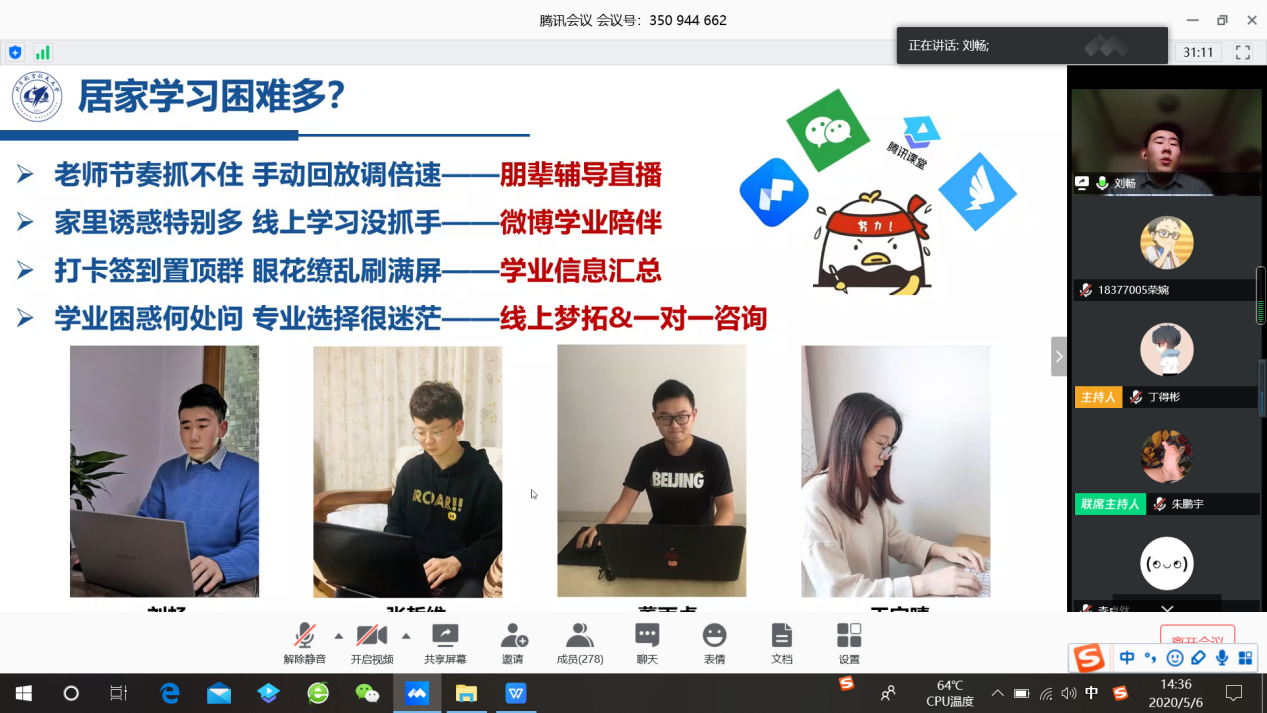 随后,来自宇航公司16级的的刘畅同学分享了学业支持小组在云端助学的故事。他们利用自己所学,尽自己所能帮助同学们解决居家学习节奏不适、注意力不集中、信息遗漏等问题的。
