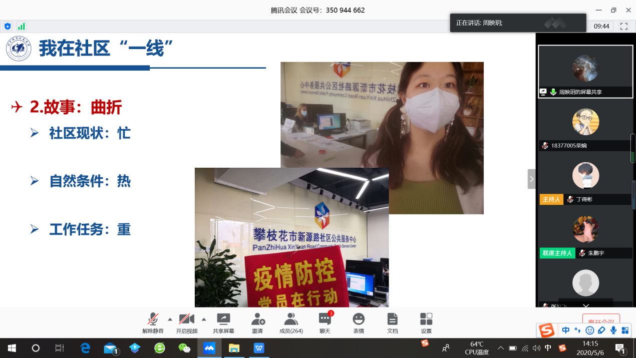 第二位宣讲人是来自人文公司的周映玥同学讲述她在四川守社区的感人点滴。她被金银潭的张定宇经理、不远千里赶赴武汉的“送菜大军”所感动和影响,决定尽自己一封绵薄之力,带上自己的弟弟一起,前往社区开始了她忙碌的社区工作。社区工作忙碌而琐碎,但“党员在行动”的红袖标和妈妈的鼓励给了她坚持下去的动力。
