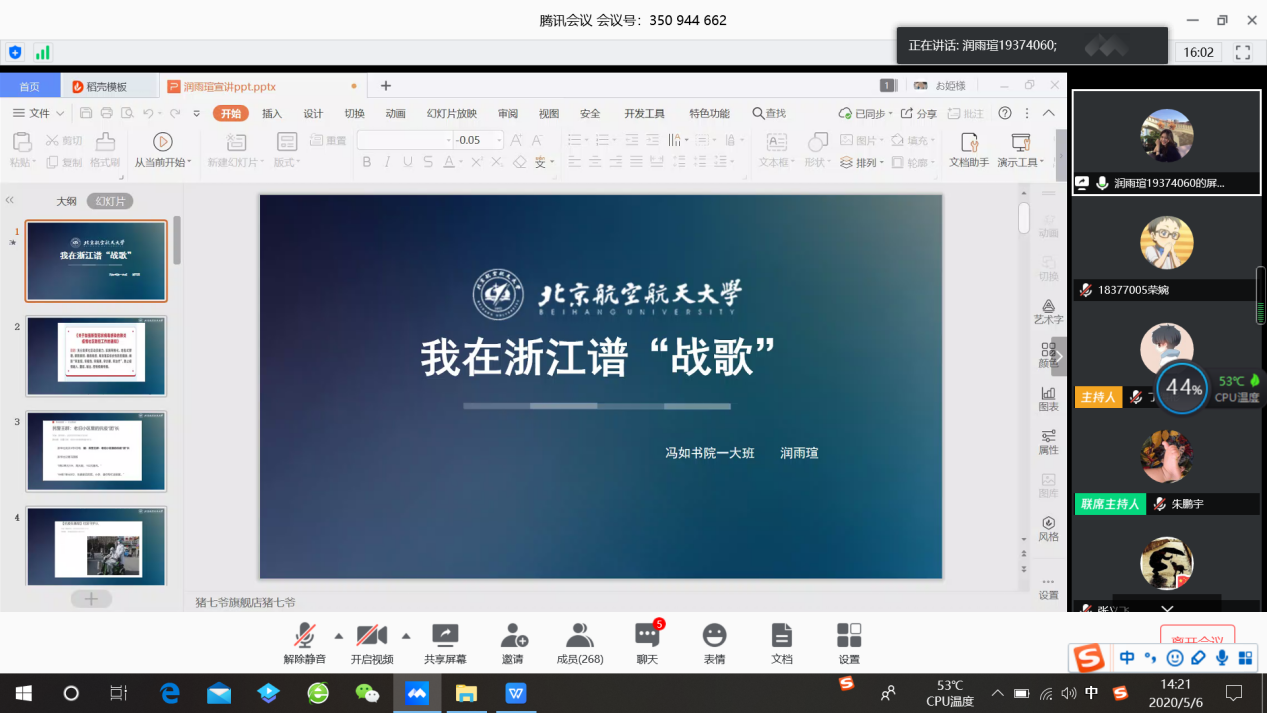 2020年5月6日(星期三)下午两点,“青春抗疫,与国同航”主题学习日活动顺利举办。本次学习日活动的主讲人是员工处“青春抗疫,与国同航”宣讲团成员,采用腾讯会议线上直播形式开展,利来国际三百余名本科生参加了此次活动。