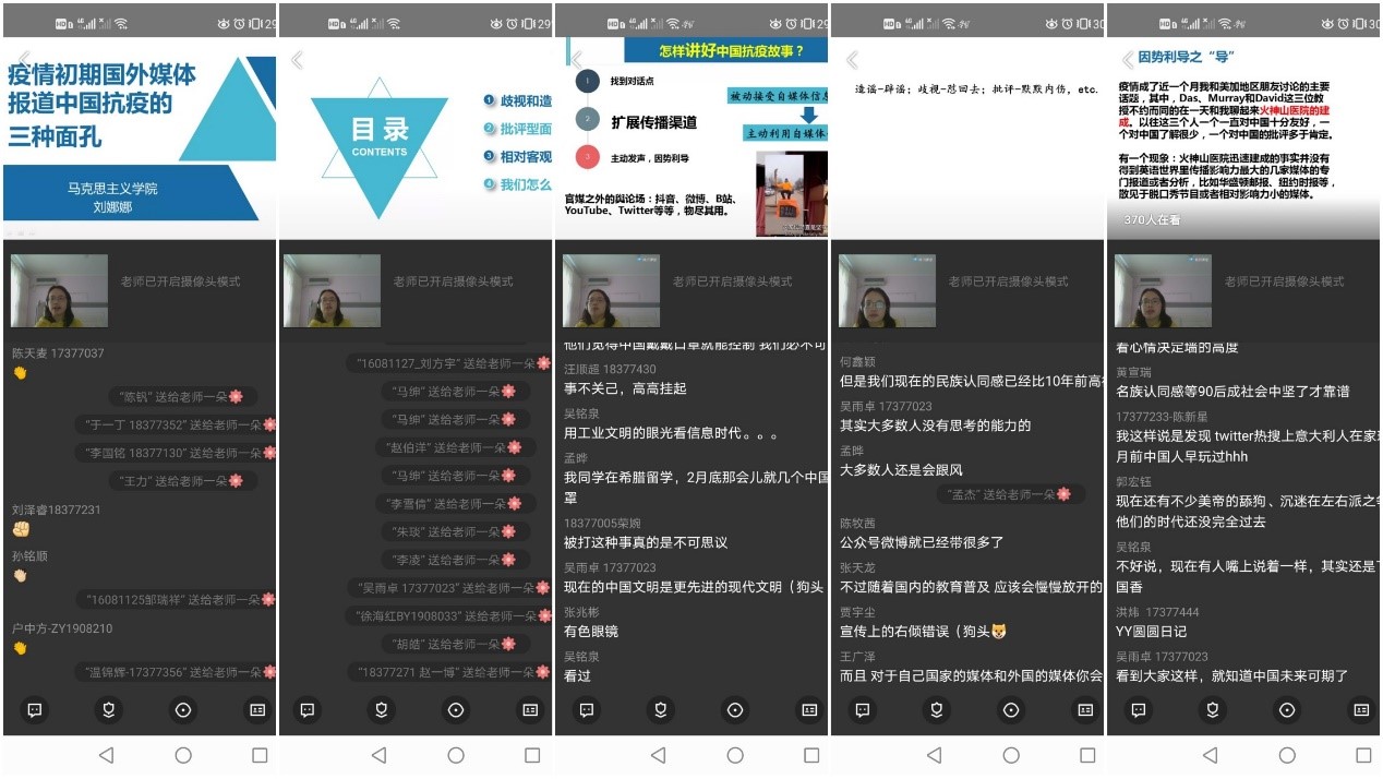 4月15日为全民国家安全教育日,刘娜娜老师首先播放了国家安全教育宣传片,今年的宣传片中出现了更多一线抗疫防疫工作者的身影,老师由此引出党课主题:《疫情初期国外媒体报道中国抗疫的三种面孔》。刘娜娜老师将“三种面孔”总结概括为了歧视和造谣型面孔、批评型面孔以及相对客观友善型面孔,针对每一种“面孔”,刘老师列举了大量的国外新闻报道时评,然后对每一种“面孔”出现的原因与造成的影响加以分析,最后刘娜娜老师呼吁中国当代青年学子应该主动利用自媒体传播信息,扩展传播渠道,主动发声,因势利导,使用正确的方法讲好中国抗疫故事。