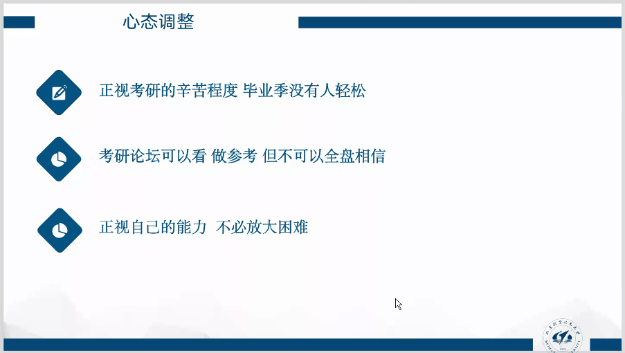 之后李璐学姐分享了自己的考研经验。主要是从考研过程中的具体操作、心态调整、科目准备等方面进行分享。并希望同学们学姐不要盲目自信,也不必要过于紧张,不要必放大困难,调整好自己的心态进行准备。