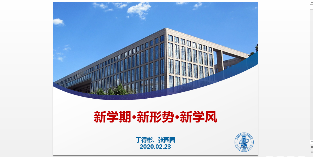 2020年2月23日15:00,1808大班2020年春季学期收假大班会顺利举办。本次大班会采取钉钉线上直播形式开展,大班会由辅导员丁得彬和辅导员张园园主持,主题是新学期·新形势·新学风,1808大班全体同学参加了此次班会。