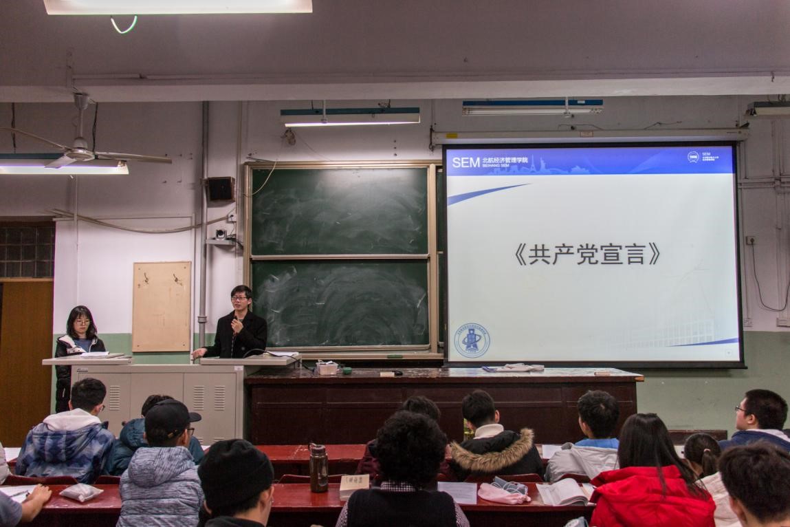 丁导先给同学们放了一小节来自电视剧《人民的名义》的片段,借片中人物的台词来引出共产党宣言的内容。随后丁导与同学们分享了自己在读《共产党宣言》时的一些体会——《共产党宣言》分为四章,篇幅短小,相信同学们读起来也会有收获。
