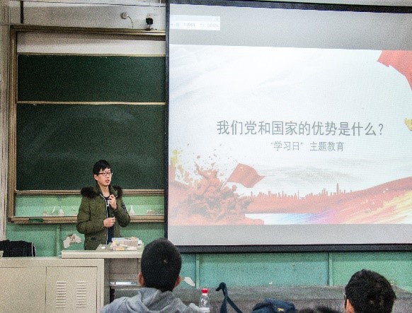 主题教育环节,丁导带领大家学习了十九届四中全会的相关精神,从全会提出的“十三个显著优势”入手解释了我们党和国家在制度建设方面的优势。丁导又从中国特色社会主义理论体系一脉相承的特点,表达了对我们党和国家治理体系优越性的自信。其后,丁导带领大家学习了十九届四中全会的“十三个坚持和完善”的内容,并将其与“十三个显著优势”进行对比,为大家带来了一堂深刻的主题教育党课。最后,丁导引用其他国家对国民教育的要求的内容,强调了爱国主义教育的重要性,并建议同学们学习十九届四中全会的内容和精神,来培养爱国的精神与情怀。