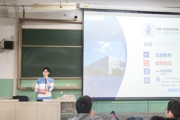 剩下三个环节由张园园导员主持。张导首先强调了学习的重要性,给同学们敲响了不努力学习肯定没有好成绩的警钟。后为同学们展示了近期的书院安排的一些重要活动,如会计学考试、学业梦拓交流会、经管晚会、期末串讲等。另外,张导通知了博雅课程选修部分增添员工干部一项,并以小班班委由大班班委打分,大班班委由导员打分的方式计入加分项;临近学期末,张导也亲切的提醒同学们要尽快补齐博雅的必修课程并及时录入。本学期进入尾声,期末考试也随之而来。张导重点强调了考试要诚信应考,严禁考试作弊行为,北航对考试作弊行为的处罚十分严厉,请同学们不要触碰红线。另外,鉴于同学们在考期中会有长时间的复习甚至通宵学习的情况,可能会影响舍友的休息,造成不必要的矛盾,张导提醒同学们在复习期间也要妥善的处理与舍友的关系,有问题要及时沟通相互理解。在最后的导员寄语环节,张导强调了纪律问题:按时到课、按时到会是对与会者基本的礼仪和尊重;鼓励同学们可以更加自信,学会展示自己,勇于展示自己,但也要更加细致、态度认真,不要再出现作业忘带等一系列小问题。