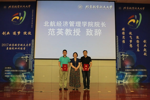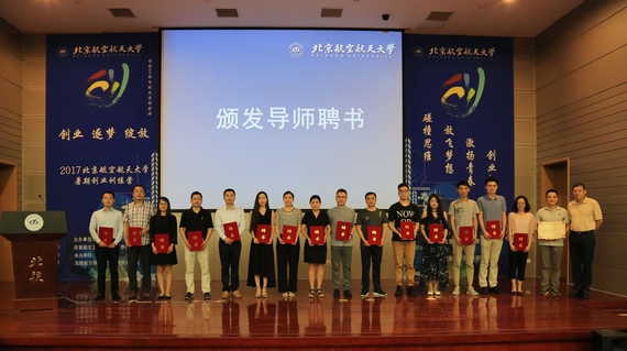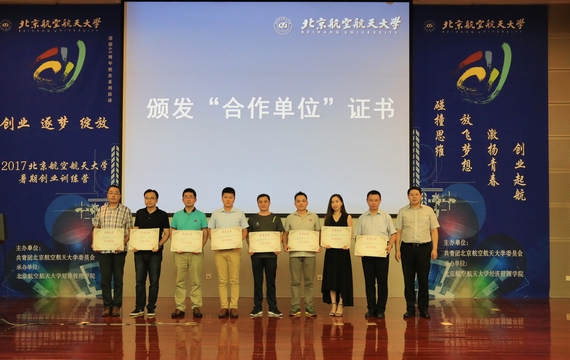 开营仪式上,北航经济管理公司党委书记刘志新、经理范英,先后为2位“金牌导师”和16位“创业导师”颁发聘书,校团委书记肖洪为8家“合作单位”颁发聘书。