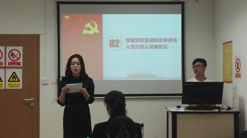 首先,由俎富豪同志统计汇报出勤情况,大会确认有效后,全体党员集体起立,合唱国际歌。随后,预备党员杨仲侠、温馨、石岩松和毕艺苇同志分别宣读转正申请,从思想进步情况、一年内仍存在的问题和今后努力方向、向党表决心三个方面进行了汇报。