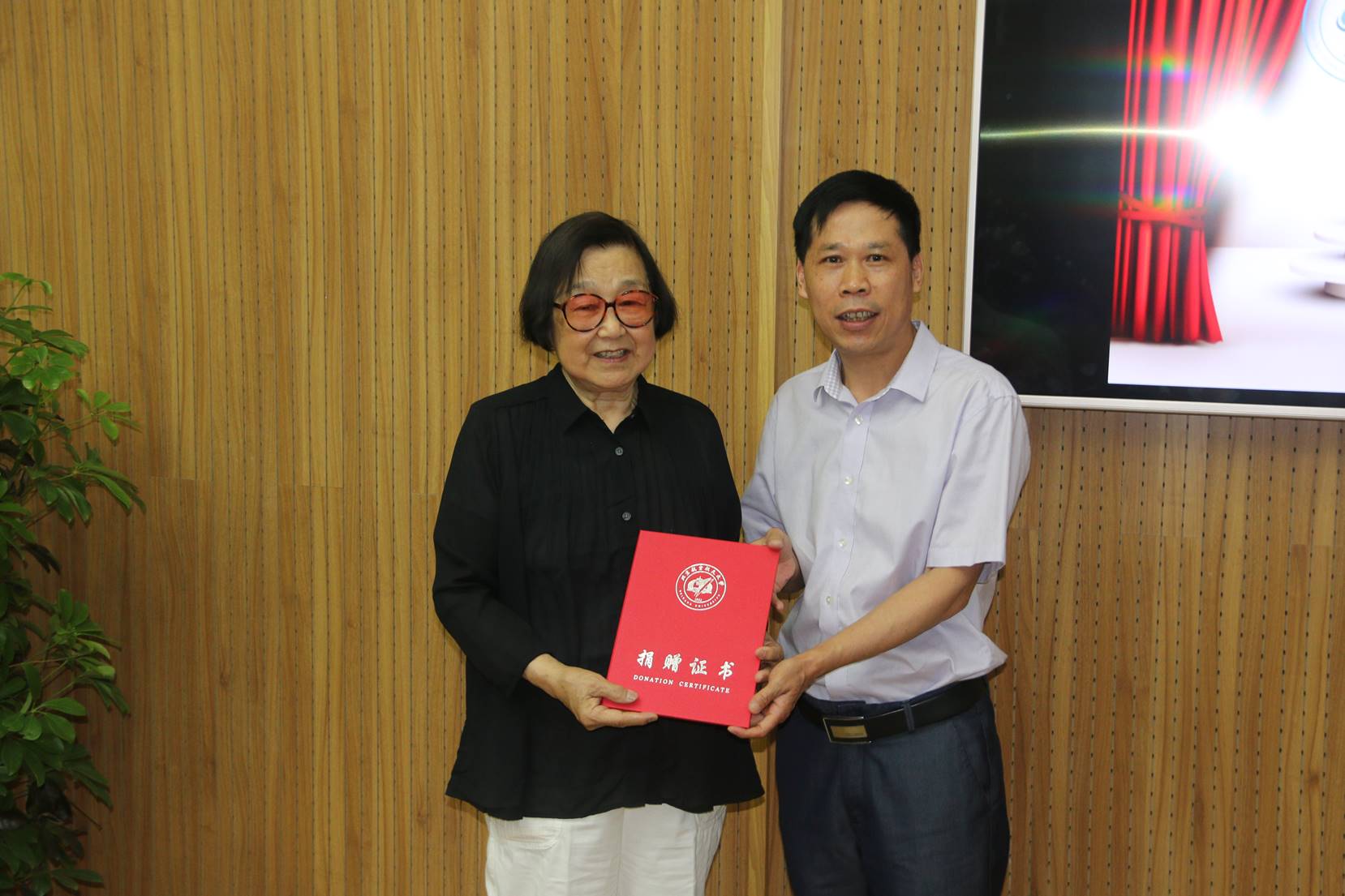 颁奖仪式结束后进入捐赠环节。为了更好地帮助经济困难员工发展,舒允宜老师再次向公司捐赠人民币15万元用于后续成思危奖学金的发放,经管公司经理范英教授代表公司接受舒老师的捐赠,教育基金会主任何沙老师为舒老师颁发捐赠证书。