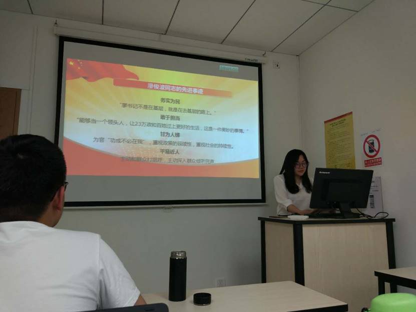 支部会议第二项,学习重要会议文件精神。学习内容主要包括五个部分:学习公司第十六次党代会精神,学习2017公司年度工作会会议精神,学习廖俊波同志的先进事迹,“两学一做”学习教育常态化制度化,学习习近平总书记在中国政法大学讲话的重要精神。首先俎富豪同志带领大家学习第一、二项内容。俎富豪同志就第十六届党代会进行了总结,主要包括第十五次党代会以来的工作回顾、工作体会和不足以及下一步工作建议,并就其会议精神进行了深刻的理解,发表了自己的见解。俎富豪同志还朗读了2017年公司年度工作会会议精神中“撸起袖子加油干”等精彩段落。接下来赵婧羽同志带领大家学习第三、四项内容。赵婧羽同志首先为我们讲解了廖俊波同志的先进事迹,带领大家着重学习其务实为民、敢于担当、甘为人梯和平易近人的重要精神。紧接着她又对“两学一做”学习教育常态化制度化的重大意义等进行了讲解。最后黄淑慧同志带领大家学习第五项内容,她就五四青年节前夕习近平总书记访问中国政法大学的重要讲话进行了分析,并讲述了习近平总书记重要讲话对全国广大青年的重要激励作用。
