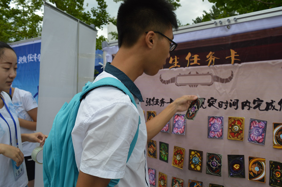 早上六点,梦拓和志愿者们在辅导员的带领下前往”世纪之声”广场进行场地布置,迎新工作于七点半准时开始。为尽可能给新生提供便利,报到处的志愿者们进行一站式作业,把办理入学手续的时间缩短到仅仅一分钟。今年经管公司采取了“游戏式迎新”,其目的是让新生尽早熟悉校园环境:利用游戏中小而有挑战性的目标来激发新生探索校园的热情。