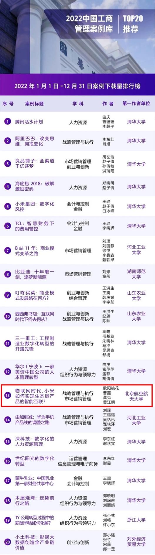 该论文发表之后,欧阳桃花教授研究团队围绕上述研究结论,延伸开发了高水平的教学案例《物联网时代,小米如何实现生态链产品的智能互联?》,围绕“构建智能互联产品体系”这一主题,从定义、难点、路径、策略和治理等方面,系统探讨智能互联产品构建模式。最终,该教学案例获得清华经管公司第四届“卓越开发者”案例大奖赛二等奖,并入选2022中国工商管理案例库TOP20榜单,位列第13位。