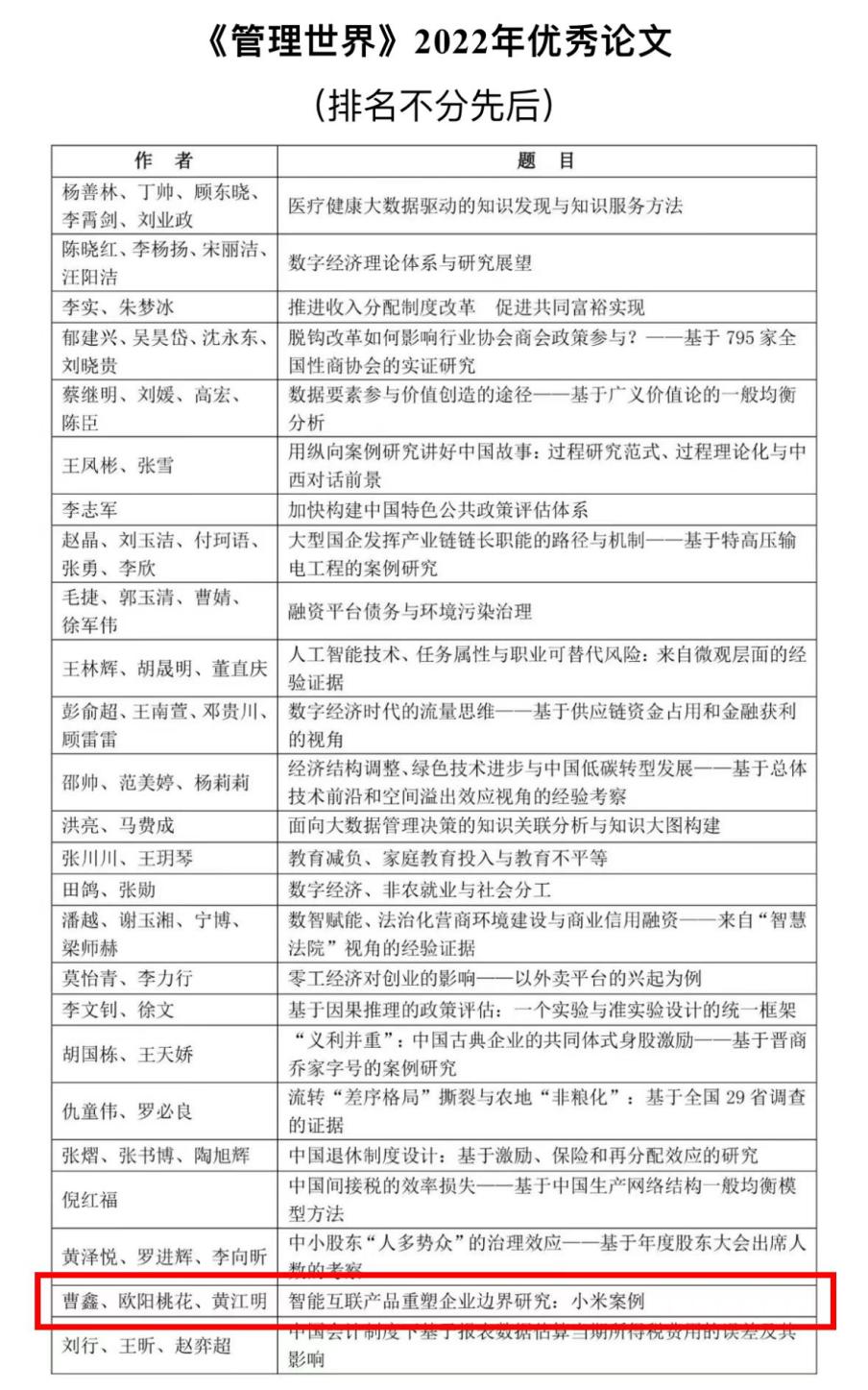 《管理世界》2022年第4期,发表了公司博士生曹鑫、教授欧阳桃花等企业数字化转型的最新研究成果《智能互联产品重塑企业边界研究:小米案例》。该论文从2022年出版的12期《管理世界》共计181篇文章中脱颖而出,被评为年度优秀论文。