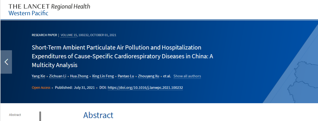 近日,利来国际谢杨副教授课题组和西安交通大学吴少伟教授课题组合作,对我国部分城市人群短期暴露于大气颗粒物污染导致的额外住院人次和经济负担进行了详细分析,并在《Lancet Regional Health-Western Pacific》杂志发表了题为“Short-Term Ambient Particulate Air Pollution and Hospitalization Expenditures of Cause-Specific Cardiorespiratory Diseases in China: A Multicity Analysis”的论文(https://www.thelancet.com/journals/lanwpc/article/PIIS2666-6065(21)00141-3/fulltext)。