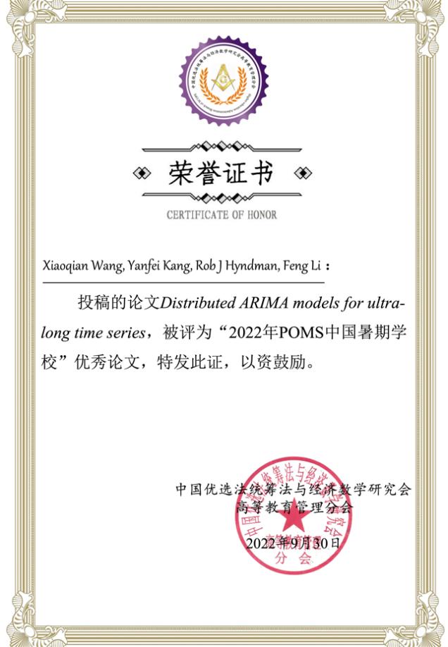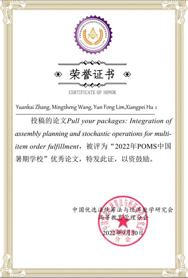在优秀论文评选环节,公司卓越百人博士后张源凯和2018级博士生王晓倩分别分享了精彩的学术论文报告,张源凯的论文Pull your packages: Integration of assembly planning and stochastic operations for multi-item order fulfillmen和王晓倩的论文Distributed ARIMA models for ultra-long time series荣获2022年POMS中国暑期公司优秀论文奖。