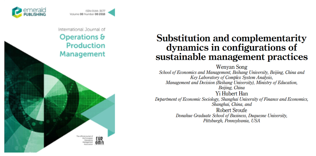 2022年7月,公司宋文燕教授及其合作者的最新研究成果“Substitution and complementarity dynamics in configurations of sustainable management practices”在运营管理权威期刊International Journal of Operations & Production Management(IJOPM)发表。合作者是上海财经大学副教授韩亦以及Duquesne University教授Robert Sroufe。IJOPM期刊为ABS列表4星期刊(ABS 4),2021年影响因子9.360。
