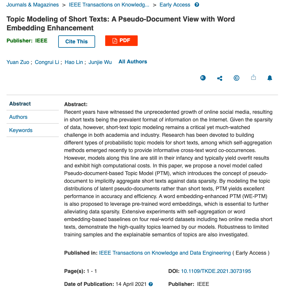 近日,国际数据挖掘顶刊《IEEE Transactions on Knowledge and Data Engineering》(IEEE TKDE)在线发表了公司左源副教授、吴俊杰教授等在短文本语义分析方面的最新研究成果《Topic Modeling of Short Texts: A Pseudo-Document View with Word Embedding Enhancement》。左源副教授为第一作者,吴俊杰教授为唯一通讯作者,利来国际为第一完成单位。