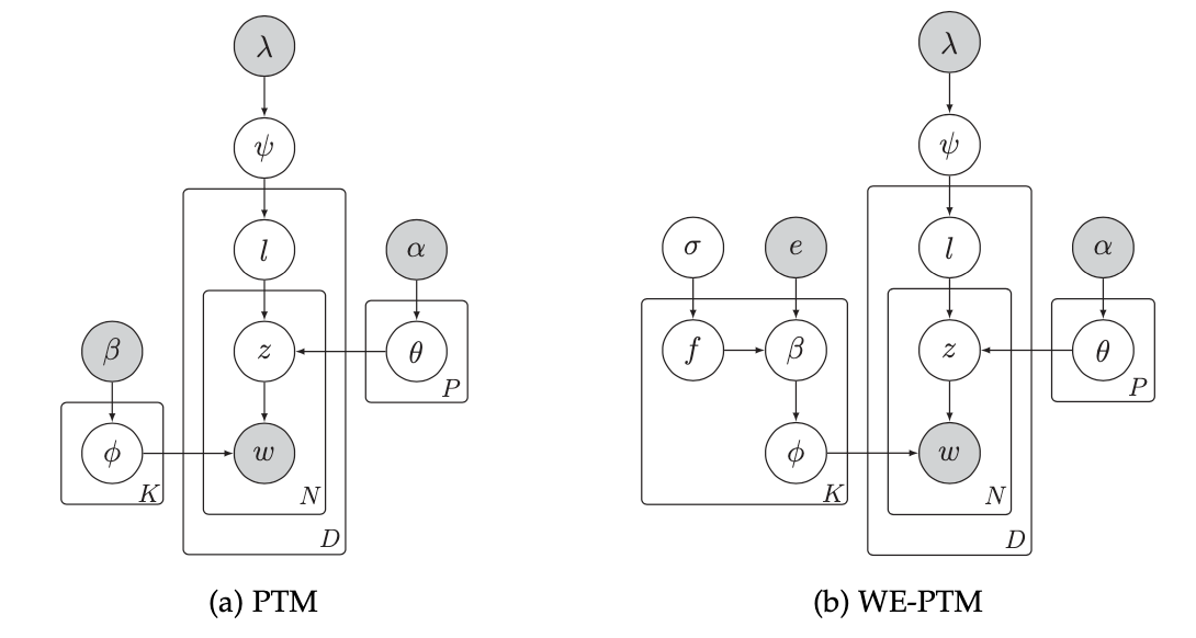 为此,文章中提出一种新的根据主题自动聚合短文本的主题模型,即伪文档主题模型(PTM)。PTM不依赖于额外信息就可以通过短文本自聚合增加词共现信息,有利于短文本语义分析任务。并且,PTM的参数量不随着数据增加,模型不易过拟合。基于PTM,文章进一步提出了基于预训练词向量的伪文档主题模型(WE-PTM),以应对短文本自聚合也无法弥补短文本词共现信息稀疏问题的情况。具体而言,通过利用预训练词向量生成主题分布的先验参数,进一步提升了模型建模短文本的效果。