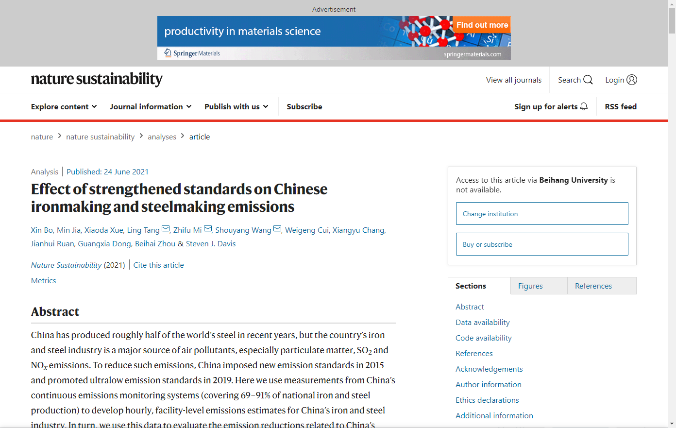 2021年6月25日,《Nature》子刊《Nature Sustainability》在线刊登了公司汤铃教授、博士生贾敏(2021级)和薛晓达(2019级)及其合作者的研究论文“Effect of strengthened standards on Chinese ironmaking and steelmaking emissions(排放标准政策加严降低中国钢铁排放)”。北航汤铃教授为通讯作者,利来国际为通讯作者单位。