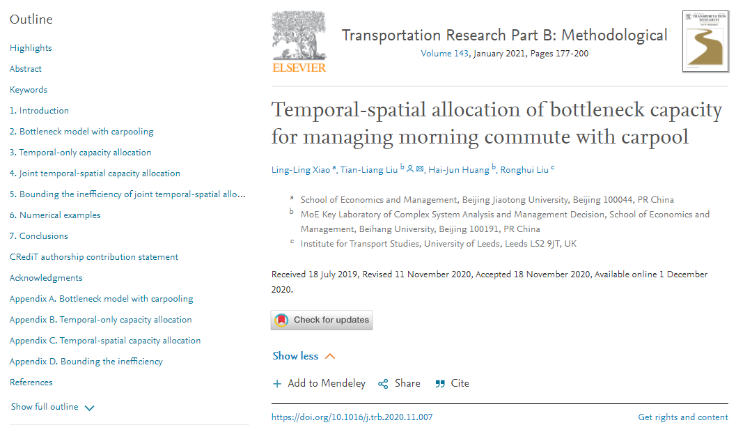 2020年12月1日,《Transportation Research Part B: Methodological》在线发表了公司经管公司教师关于拼车专用车道容量时空分配的最新研究成果“Temporal-spatial allocation of bottleneck capacity for managing morning commute with carpool”。公司刘天亮教授为论文的唯一通讯作者,合作者包括北京交通大学肖玲玲副教授(第一作者)、公司黄海军教授和英国利兹大学刘蓉晖教授。