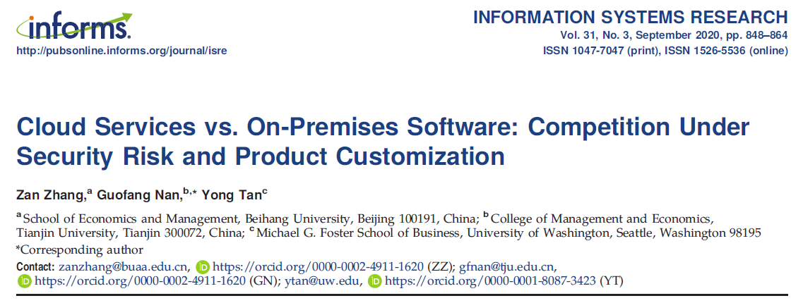 2020年9月,信息系统顶级期刊《Information Systems Research》刊发了公司经管公司卓百博后张赞在云计算服务安全方面的最新研究成果“Cloud Services vs. On-Premises Software: Competition Under Security Risk and Product Customization”。公司张赞为第一作者,合作者包括天津大学南国芳教授和美国华盛顿大学TanYong教授。