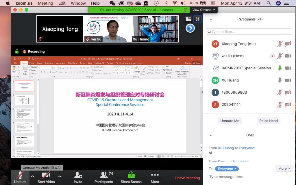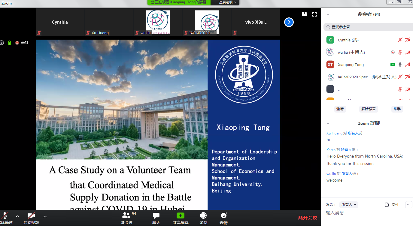 2020年4月13日,经管公司领导力与组织管理系助理教授童小平博士在中国管理研究国际协会(IACMR)2020新冠肺炎COVID-19爆发与组织管理应对专场研讨会做了分会场报告。她所报告的研究主题为“在应对湖北新冠肺炎疫情中协调医疗物资捐赠的志愿团队个案研究”,来自全球不同地方的百余名学者参加了这场报告会。