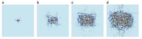 在200*200的晶格网络上展示了第一、三、五、七阶段级联传播情况。abcd四幅图中,深蓝色节点代表在当前一个阶段当中刚刚失效的节点,黑色节点代表本阶段之前就已经失效的节点,青色的节点代表目前尚未失效的节点。