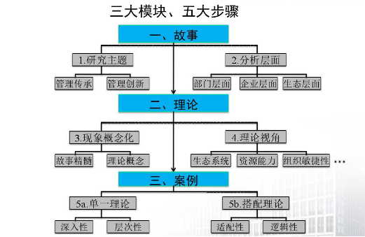故事 、理论、分析是开发优秀的教学案例与研究案例的共性元素。教学案例与研究案例的开发包括研究主题、分析层面、现象概念化、理论视角与理论,它们之间的层次关系结构如下图所示:
