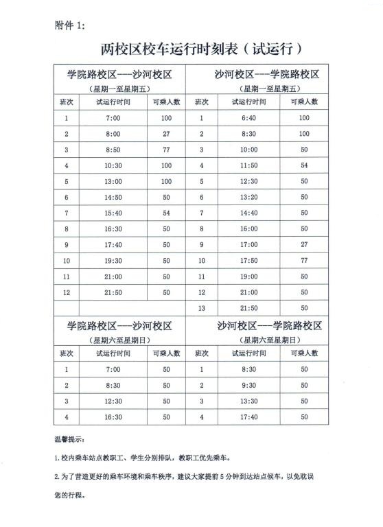 根据新学期两校区校车运行实际情况,为尽量满足往返两校区师生对校车的使用需求,自2018年10月29日起,对两校区校车运行时刻表(试运行)进行微调,沙河摆渡班车时间不变。请您认真查看校车时刻表,以免延误您的出行。