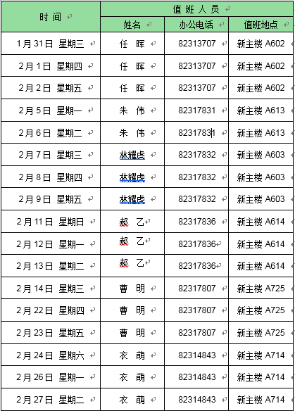 2.寒假期间申请加盖院章、使用会议室(A612)和教室(A949),请联系当日值班人员。
