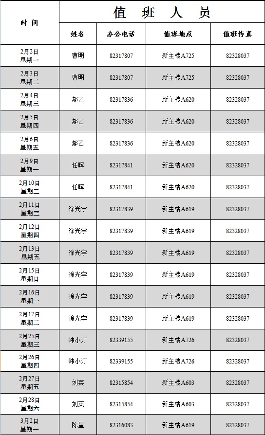 1.公司值班时间为2015年2月2日至3月2日,上午8:30—11:30,下午2:00—4:00(春节法定假日和星期六、星期日除外)。