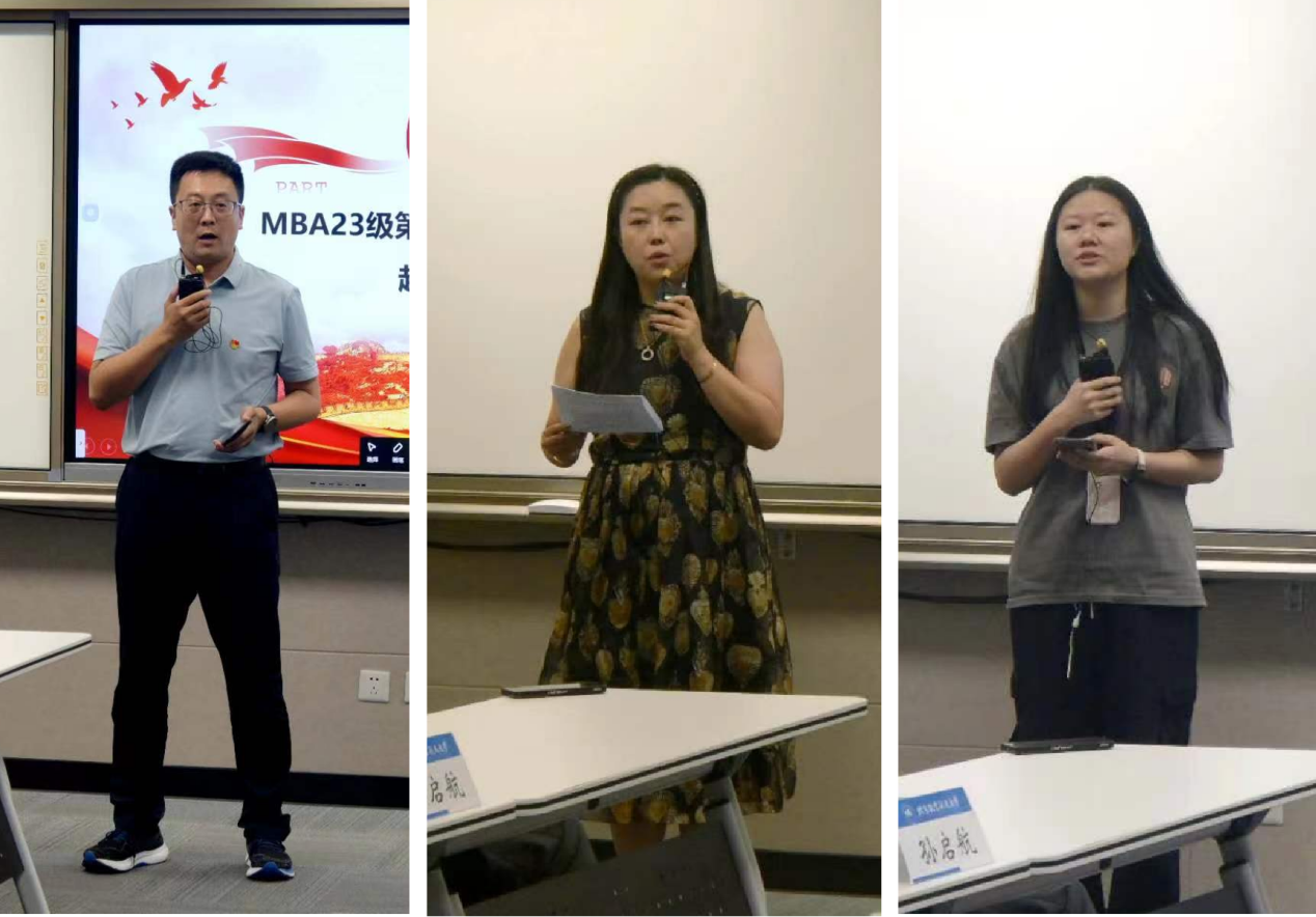 接着,MBA23级第一临时党支部书记赵骥、BY2308党支部书记丁玮和本科2108(一)党支部书记尹滢滢分别介绍各自支部的基本情况,并对本次交流活动表示了热切的期待,希望此次活动能为支部成员提供宝贵的学习机会,进一步增强党支部的凝聚力。