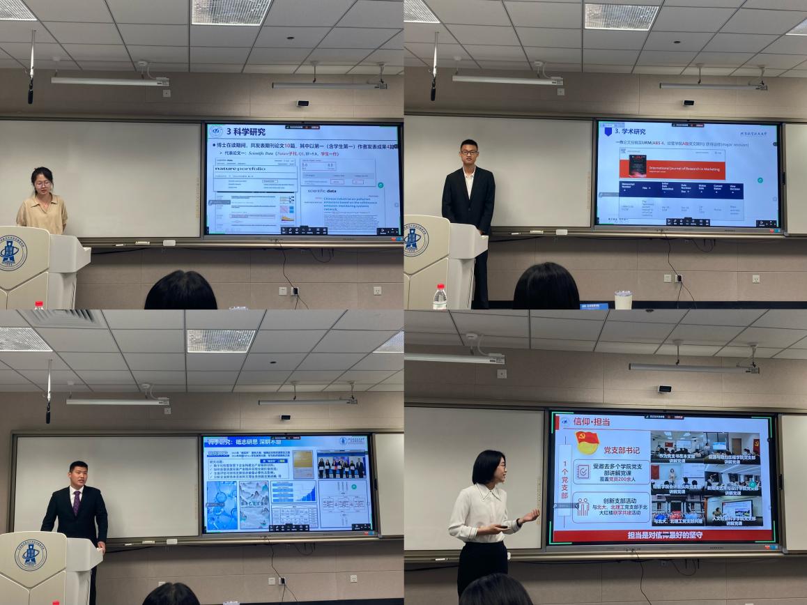 在答辩会上同学们按照抽签顺序依次进行答辩。候选者从学习生活、社会实践、学术科研、创新创业等方面展示了自己,体现出经管学子以公司作为平台,脚踏实地践行“德才兼备、知行合一”校训的精神风貌。丰硕的荣誉记录着同学们追梦路上的点点滴滴,他们以实干整饰自我,以笃行去丰盈青春。经过评委投票,公司最终评选出3名博士国家奖学金推荐人和4名硕士国家奖学金推荐人。