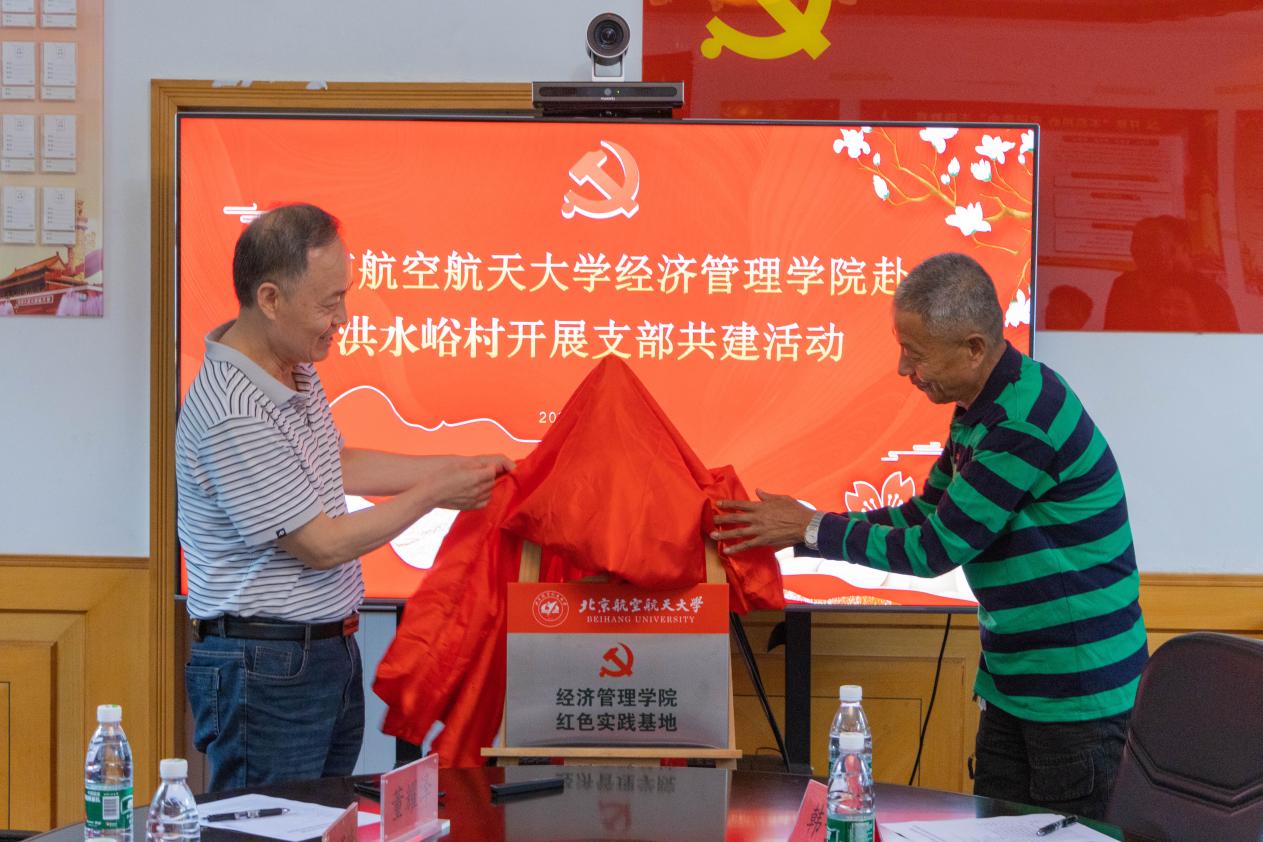 活动伊始,双方就自身情况进行简单介绍,随后针对北航经管公司与洪水峪村合作的实践项目进行了全面深入的交流。MEM临时党支部董耀泽同学详细汇报洪水峪村新农村旅游品牌建设与服务平台开发项目的项目进度和发展规划,并通过小程序演示向村民展示了项目的创新成果。该项目旨在通过科技赋能,打造洪水峪村旅游品牌,提升乡村经济发展水平。双方就项目可行性、潜在问题等进行了充分讨论,并表达了深入开展合作的强烈愿望。随后,闪四清老师和王全忠主任共同为“利来国际红色实践基地”揭牌,标志着双方合作迈上新台阶。