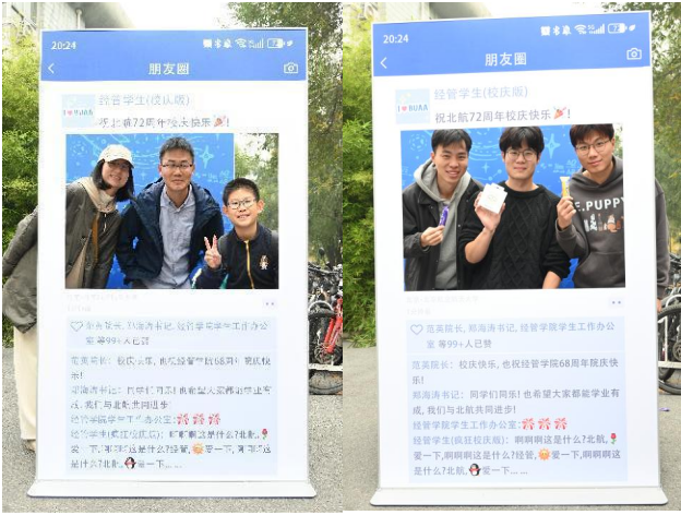 经管特色展板前,在校师生、员工纷纷露出笑容,或手持奖品,或举起祝福标语,上前合影,记录精彩一瞬,为北航72周年校庆献上美好祝福。