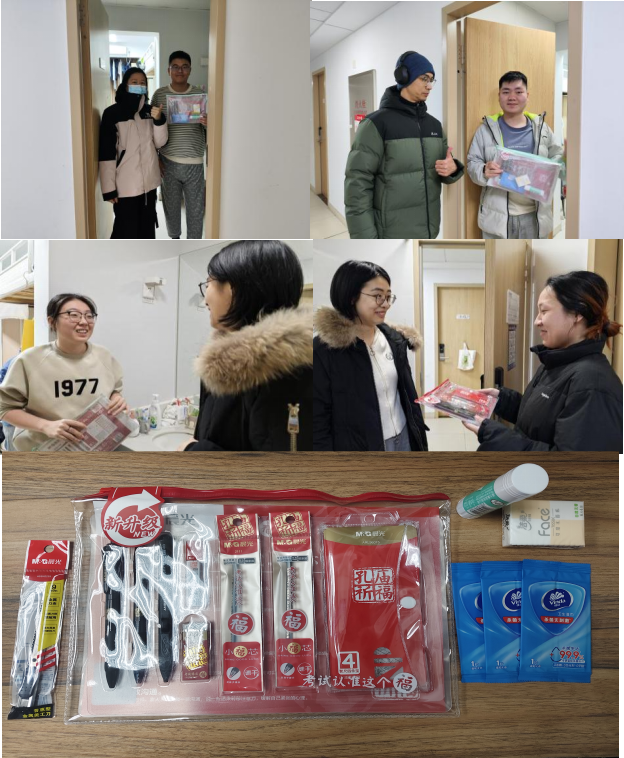 结合备考实际需求,公司为每一位考研同学精心准备“考研大礼包”,内含考试必备文具、湿巾、纸巾等实用物资。12月14日晚,辅导员逐一走访员工宿舍,将礼包送到同学手中,与大家交流备考进展,为大家加油打气。针对备考过程中的常见问题,辅导员提供了实用的建议,并提醒同学们科学规划时间,以最佳状态迎接考试。