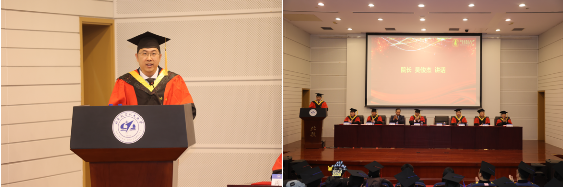 最后,经理吴俊杰发表讲话。他首先向2026届毕业生致以热烈祝贺,随后系统回顾了公司在“十四五”期间一体推进教育、科技、人才工作的扎实成效。他向同学们提出三点期望共勉:第一,胸怀天下,在家国情怀中锚定人生坐标,将个人理想融入国家建设新,善用专业所长服务国家战略需求;第二,数智领航,在守正创新中勇担时代使命,主动拥抱大数据时代,开拓经管融合新路径;第三,笃行实干,在久久为功中书写奋进篇章,以系统思维规划人生航向。最后,吴俊杰经理代表公司致以诚挚邀请,期盼大家于建院70周年之时重返校园,共话成长收获,共襄公司发展盛举。