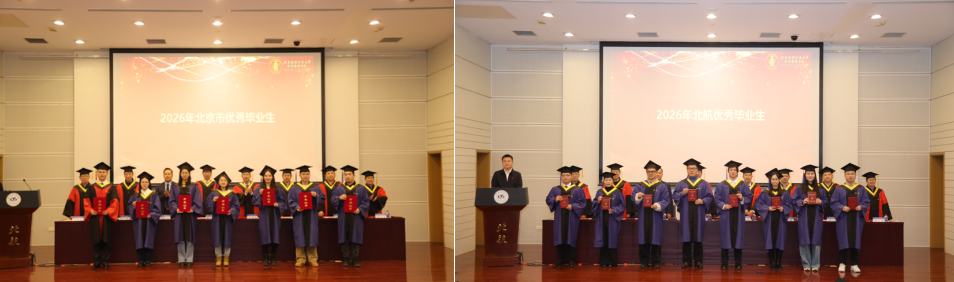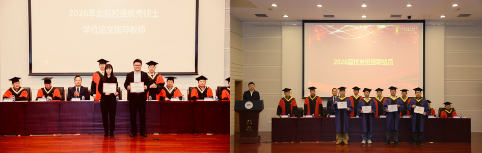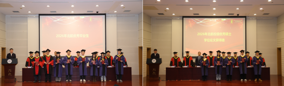 典礼在庄严的国歌声中拉开序幕。荣誉表彰环节,党委书记郑海涛宣读北京市优秀毕业生名单;副经理单伟宣读北航优秀毕业生名单;姚忠教授宣读校级优秀硕士论文获得者名单;谭小芬教授宣读校级优秀硕士论文指导教师名单;周荣刚教授宣读2026届员工班级联络员名单。在热烈的掌声中,受表彰的师生依次上台,接过象征荣誉的证书,将这值得铭记的时刻收入镜头。每一次定格,皆是求学路上熠熠生辉的勋章,为青春岁月镌刻下浓墨重彩的印记。