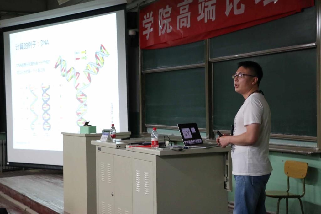 然后刘译璟先生介绍电子计算机与摩尔定律,从计算的主题引出计算机。因特尔的创始人摩尔提出,当价格不变时,集成电路上可容纳的元器件的数目,约每隔18-24个月便会增加一倍,性能也将提升一倍;然而,这个趋势持续了半个多世纪后似乎达到了一种物理极限,电子隔板足够薄时出现的漏电现象将使摩尔定律失效。沿着提升计算机性能的思路,刘译璟先生以首台商用量子计算机——D-Wave量子计算机为例,从原理出发向同学们介绍量子计算机——这是一类遵循量子力学规律进行高速数学和逻辑运算、存储及处理量子信息的物理装置,他同时也介绍了我国在量子计算方面的卓越成果。