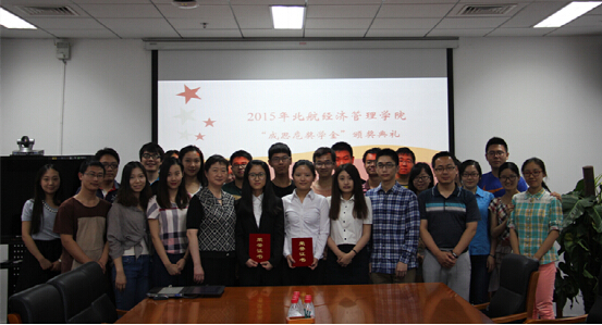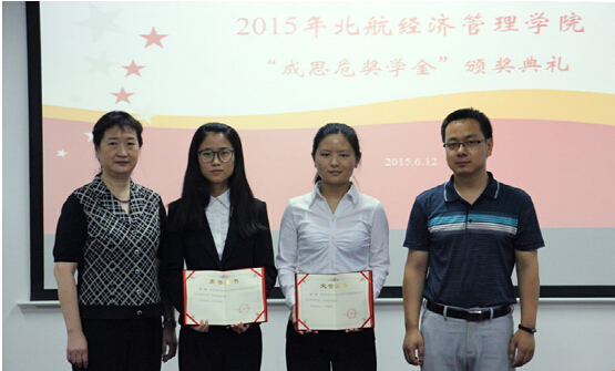 王惠文老师代表成思危先生向获奖的两位同学表示祝贺,并转达了成思危先生对经管公司学子的关心和慰问。王惠文老师介绍了成思危先生的光辉事迹,分享了聆听成思危先生讲座的感悟和体会:成思危先生先后三次做客北航经管公司高端论坛,分别以管理、经济、人生三个主题进行讲座。讲座中,成先生多次提到振兴中华需要靠教育,当今的社会需要具有扎实的知识技术、战略布局的意识和协调各方能力的综合人才,经管公司的学子需加倍努力,明确人生的目标方向,全力以赴;做人正直,做事认真,做学问勤奋;自强不息,逆境不沉沦,顺境不懈怠,做一个坚定的唯物主义者、务实的理想主义者和审慎的乐观主义者,同时希望同学们在成长过程中,明白生命的意义,肩负起时代的责任和使命,成为社会的支柱和国家的栋梁。王惠文老师再次代表公司向获奖的两位同学表示祝贺。