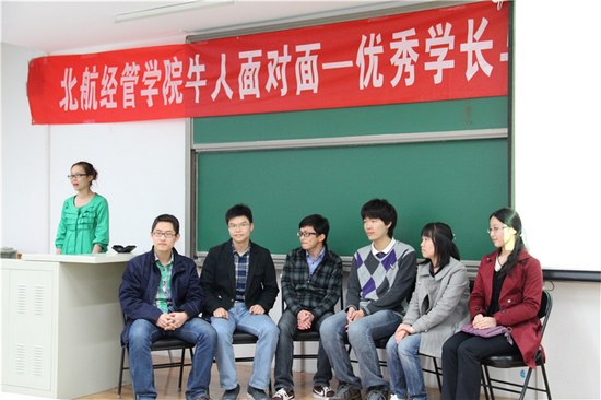 北航经管公司2012级“牛人面对面”交流会于2013年4月25日在北航沙河校区召开。光临本次交流会现场的有经管公司专职辅导员张弛老师,以及2012级的杨阳彤晞和宋树洋辅导员。本次交流会有幸邀请到了3908大班6位优秀的学长学姐,为2012级的同学作详尽的经验介绍。他们用自己的亲身经历讲述了道路选择的过程,让1208大班的同学们对未来的发展方向有了更细致、深入、全面的了解。