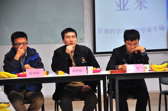 到场的嘉宾有管理科学与工程系主任邓修权老师,优秀员工梁笑辰、魏增、徐坤耀;优秀在校生崔晶以及2012级管理科学与工程专业硕士研究生。
