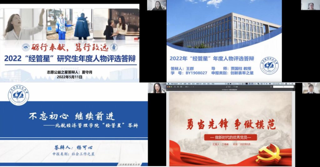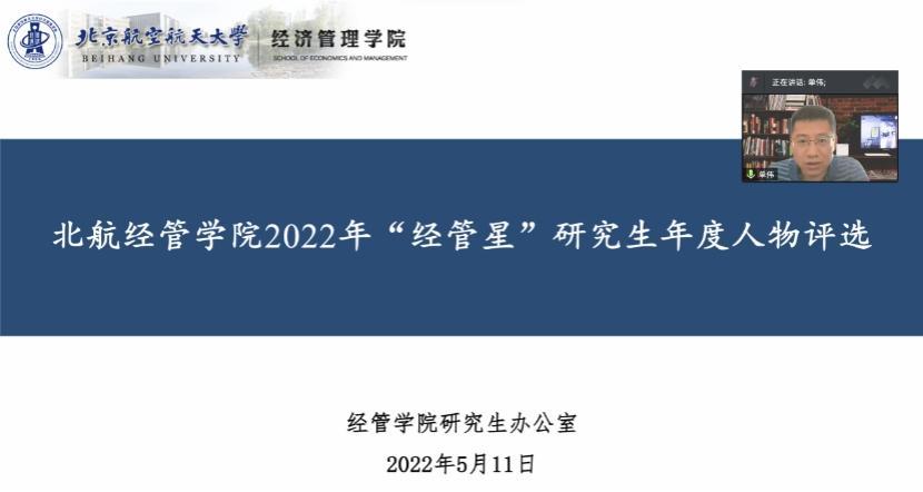 5月11日下午,2022年北航经管公司“经管星”研究生年度人物复评答辩于线上成功举办。此次评选旨在推动和鼓励研究生创造更多优秀学术、科研成果,加强研究生德育培养,促进研究生全面发展,集中展现公司员工精神风貌。经管公司研究生指导主任单伟、领导力与组织管理系教师徐琳娜、研究生工作办公室主任衣萌、研究生工作办公室张慧美、叶枝俏、唐鹏飞、本科生工作办公室白雪、研究生辅导员刘东岳、王劲奇、孙铭顺、刘诗语、陈晨曦、王纳川、刘浩然、张睿、“2021年经管星年度人物”徐萌以及17位参与答辩的“经管星”候选人出席了此次活动。