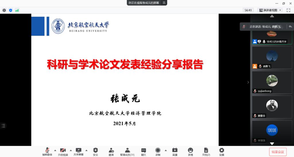 为提升研究生科研水平,营造良好的学术交流气氛,5月28日下午,经管公司研究生工作办公室组织了专题博士沙龙,邀请博士研究生国家奖学金获得者张成元同学做主题交流,分享科研经验。沙龙活动通过腾讯会议在线举行,研究生工作办公室主任衣萌、辅导员唐鹏飞以及30余名研究生参加。