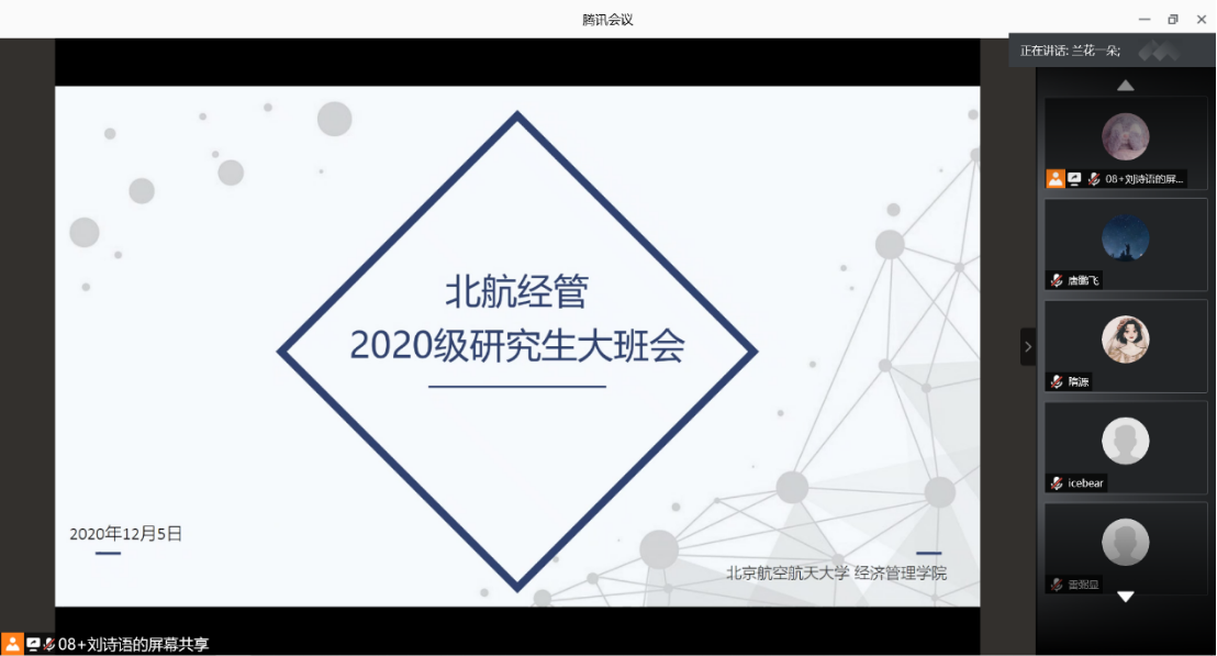 2020年11月5日,经管公司召开2020级硕博研究生大班会。会议通过在腾讯会议平台在线举行,全体2020级硕博研究生参会,研究生办公室主任衣萌老师出席并做相关工作安排。会议由硕士辅导员刘诗语主持。
