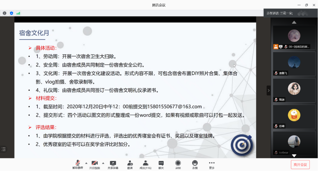 衣萌老师就疫情防控教育、学风建设、心理健康教育、安全与保密教育及近期安排等内容进行了讲解。衣萌老师强调目前疫情防控依旧非常重要,非必要不要离校离京。同时,随着考期的到来,切忌考试作弊的行为,建议大家积极调整考期的心态。此外,衣萌老师对即将开展的宿舍文化月活动进行了讲解和动员,号召同学们在课余时间积极参加活动,营造良好的宿舍文化氛围。