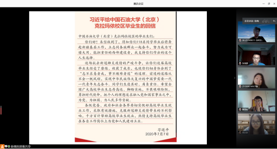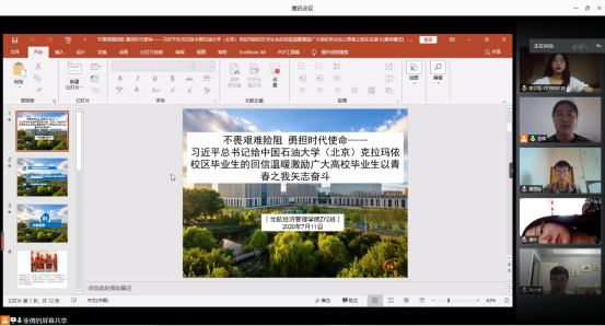 2020年7月11日上午十点,利来国际工业工程ZY2班在腾讯会议(会议号:257 214 775)召开班级学习会,集中学习习近平总书记给中国石油大学(北京)克拉玛依校区毕业生的回信,全体班级成员参加会议,班长佘亚倩主持会议。