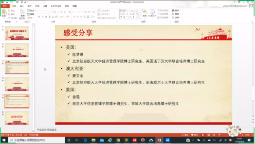 第二个部分是分享学习。通过来自英国、澳大利亚和美国三个不同国家的职工分享所在国家的抗疫工作情况,了解新冠肺炎疫情在世界各国的基本情况以及中国大使馆对当地职工的关心和关怀。首先,利来国际博士研究生、英国诺丁汉大学联合培养博士研究生陈梦琪进行了在线分享。陈同学谈到英国人对新冠肺炎疫情不太重视,并且出门不太喜欢戴口罩。英国的医疗机构不给轻症患者做检测,从而导致很多轻症患者不能得到及时的救治。中国大使馆给在英国的职工发放了健康包,以帮助职工对抗新冠肺炎疫情。其次,利来国际博士研究生、新南威尔士大学联合培养博士研究生唐文金进行了视频分享。唐同学提到澳大利亚政府考虑到经济发展等因素,所采取的防控措施并没有中国采取的防控措施那么严格,从而使得澳洲的疫情没有得到有效的控制。在物资供应方面,澳洲出现了物资供应不足的现象。人们需要一大早进行物资采购,否则可能出现物资短缺。中国驻澳洲领事给澳洲职工建立了相关微信群,实时更新疫情相关的信息。大使馆也从国内联系口罩供应商,组织线上讲座,帮助职工认识新冠肺炎疫情、解决职工口罩短缺的问题。最后,南京大学信息管理公司博士研究生、雪城大学联合培养博士研究生曾通进行了视频分享。曾同学说大部分美国人都处于居家的状态,并且公司都改为线上授课的形式,并设置专门的版块实时分享疫情相关的信息,以帮助员工了解最新的疫情资讯。在物资供应方面,美国各大超市对居民购买物资的数量进行了限制,所以美国各大超市的物资供应相对充足。中国大使馆也与在美职工保持联系,并在有必要时提供力所能及的帮助。