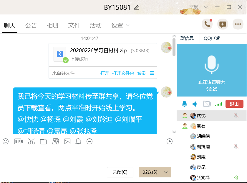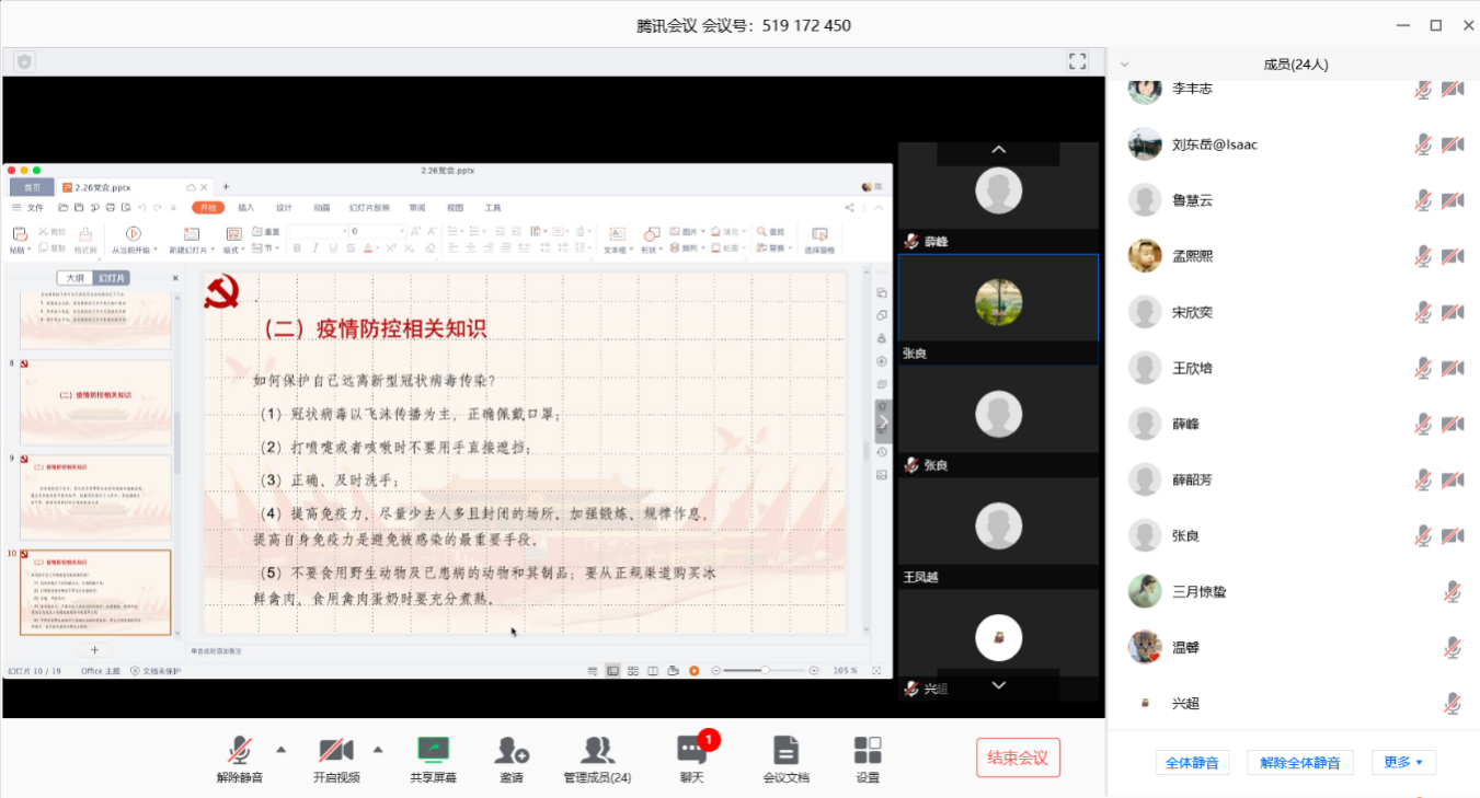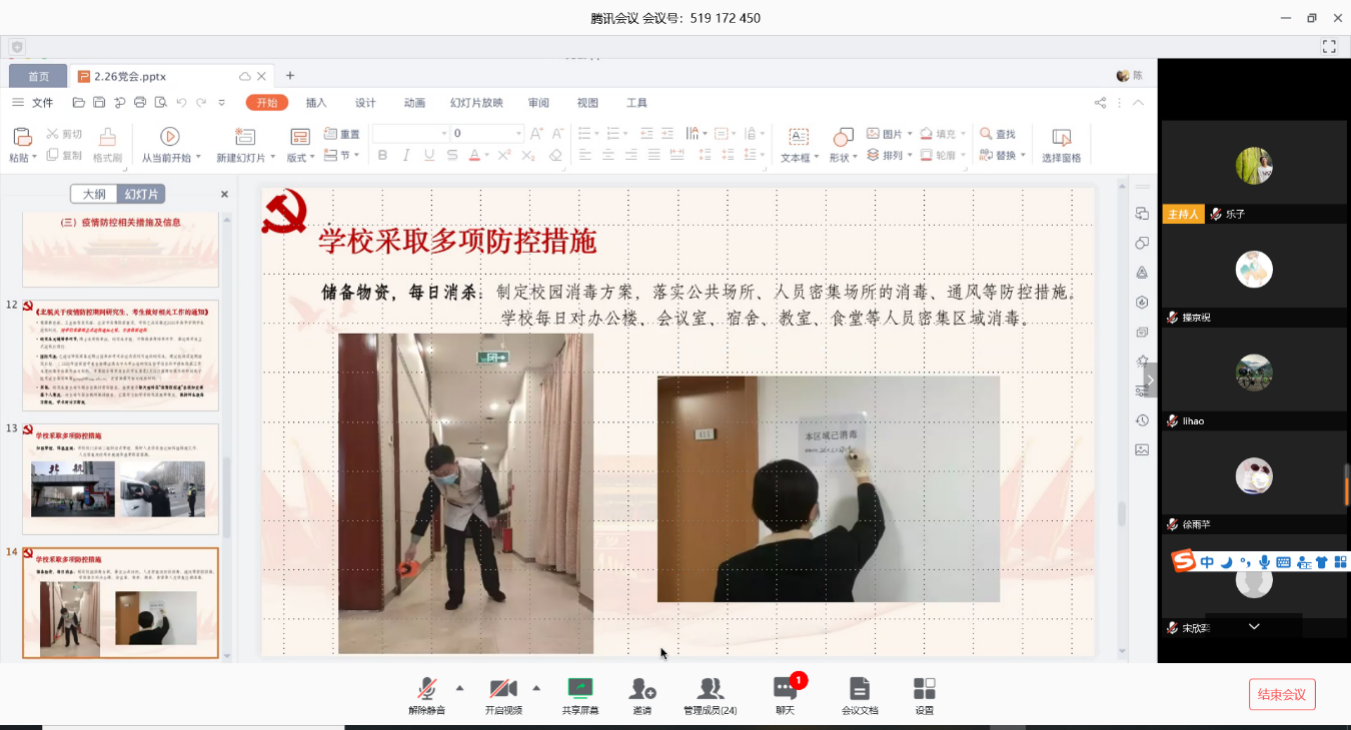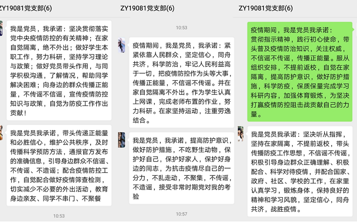 会议中,许多来自湖北的党员同志也纷纷发言。BY1608党支部的黄婷婷同志和冯乾同志表示“现在我们都是居家隔离,一般不让进出小区,紧急情况需要出入证明。关于日常物资的需求则会有专门的相关部门人员帮忙采购。当地的疫情的防控工作在有条不紊的进行着,我们的身心状况都比较健康。”ZY1908(二)党支部的李立恒同志他介绍了其家乡湖北孝感的疫情情况,并表示出了战胜疫情的信心:“湖北孝感目前疫情是非常严重的,确诊人数居全国第二”,“目前家里的蔬菜肉类等必需物品重足,如要购买,有小区统一统计,并无接触式配送。所以现在虽然疫情严重,但是依然有信心能打赢这场战役。”